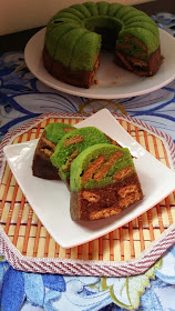 - Kemudian tuangkan adunan warna coklat ke atas adunan warna hijau yang telah dikukus tadi. Ratakan. Goyang-goyang dan hentak loyang biar mampat